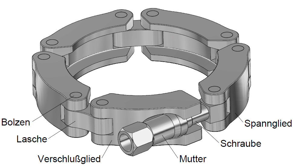 n der Regel bestehen Schnellverbindungen aus zwei Flanschen und einer Spannkette. Wenn Medien zu dichten sind, kommt noch eine Dichtung dazu. Die Flansche müssen im Konusbereich rotationssymetrisch sein. Sie werden an die zu verbindenden Teile angeschweißt, angeschraubt oder direkt angearbeitet.