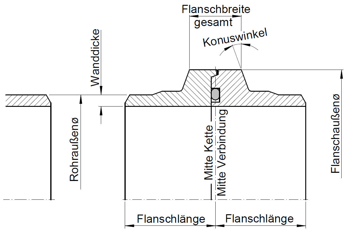 Die Ausführung der Flansche wird durch den Kunden vorgegeben oder in Absprache mit dem Kunden definiert. Nebenstehend ist die gängigste Flanschform dargestellt. (Warnsymbol) Bei der Gestaltung der zu verbindenden Bauteile müssen die Angaben und Sicherhinweise unter „Technische Informationen“ (Link) befolgt werden.