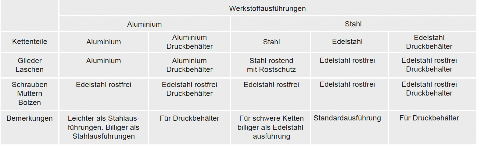 Die Spannketten sind in mehreren Werkstoffausführungen, auch nach Kundenangaben, lieferbar. Hier eine grobe Übersicht.