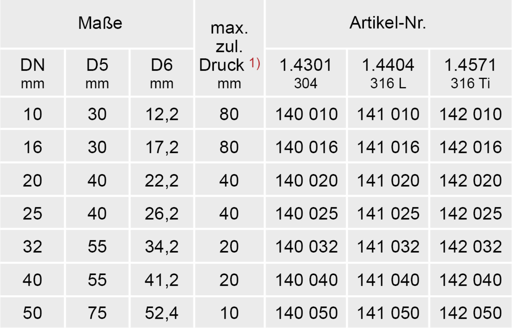 1) Die o.g. Angaben für den maximal zulässigen Druck gelten für folgende Bedingungen: keine besonderen Temperaturen und keine weiteren